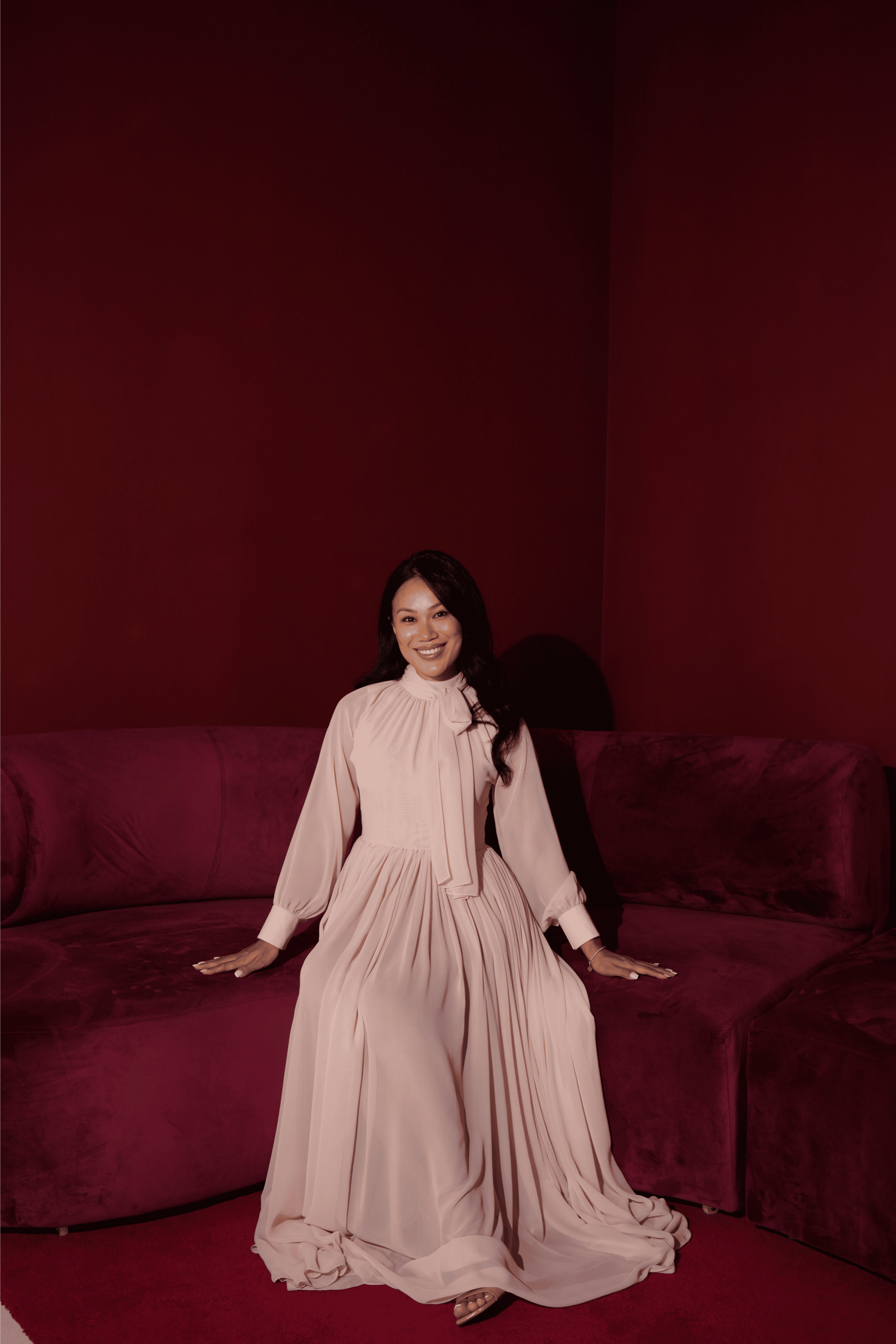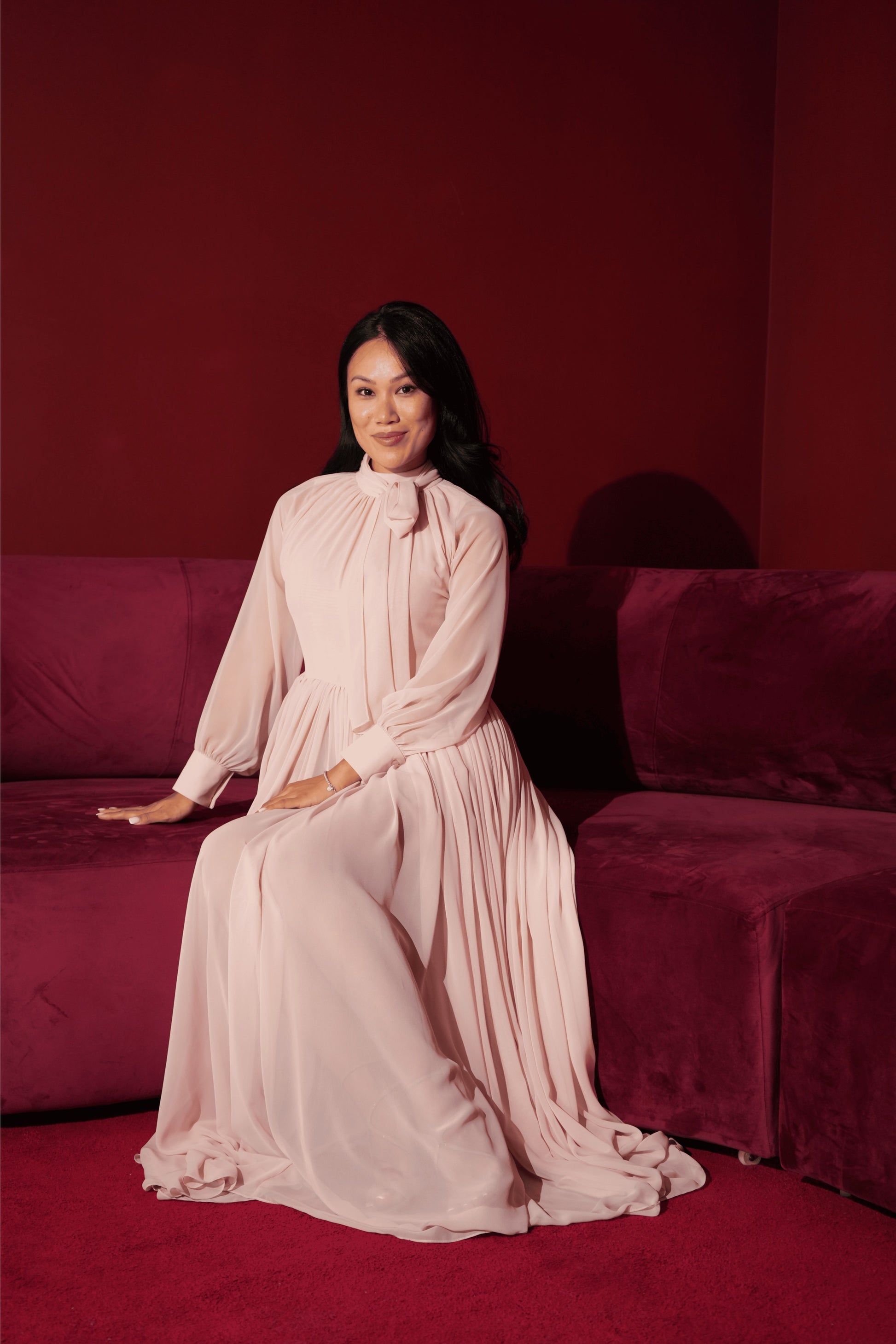 The Clarissa dress is made from soft blush pink chiffon and showcases a graceful, flowing design. It features a delicate pussy bow tie at the neck and cuffs on the sleeves, enhancing its feminine aesthetic. The long, airy silhouette creates an elegant and timeless look, highlighting its effortless charm.