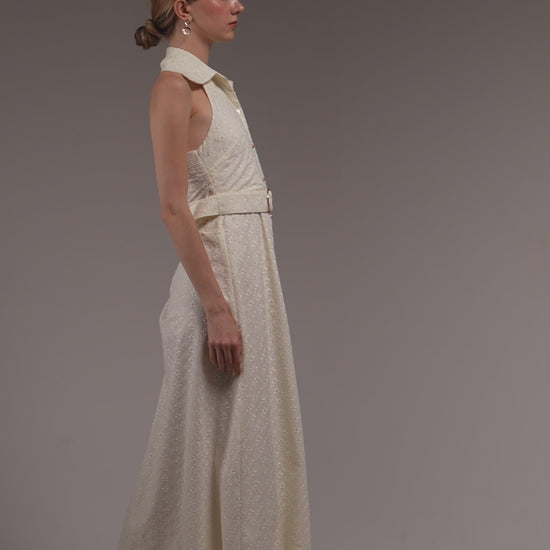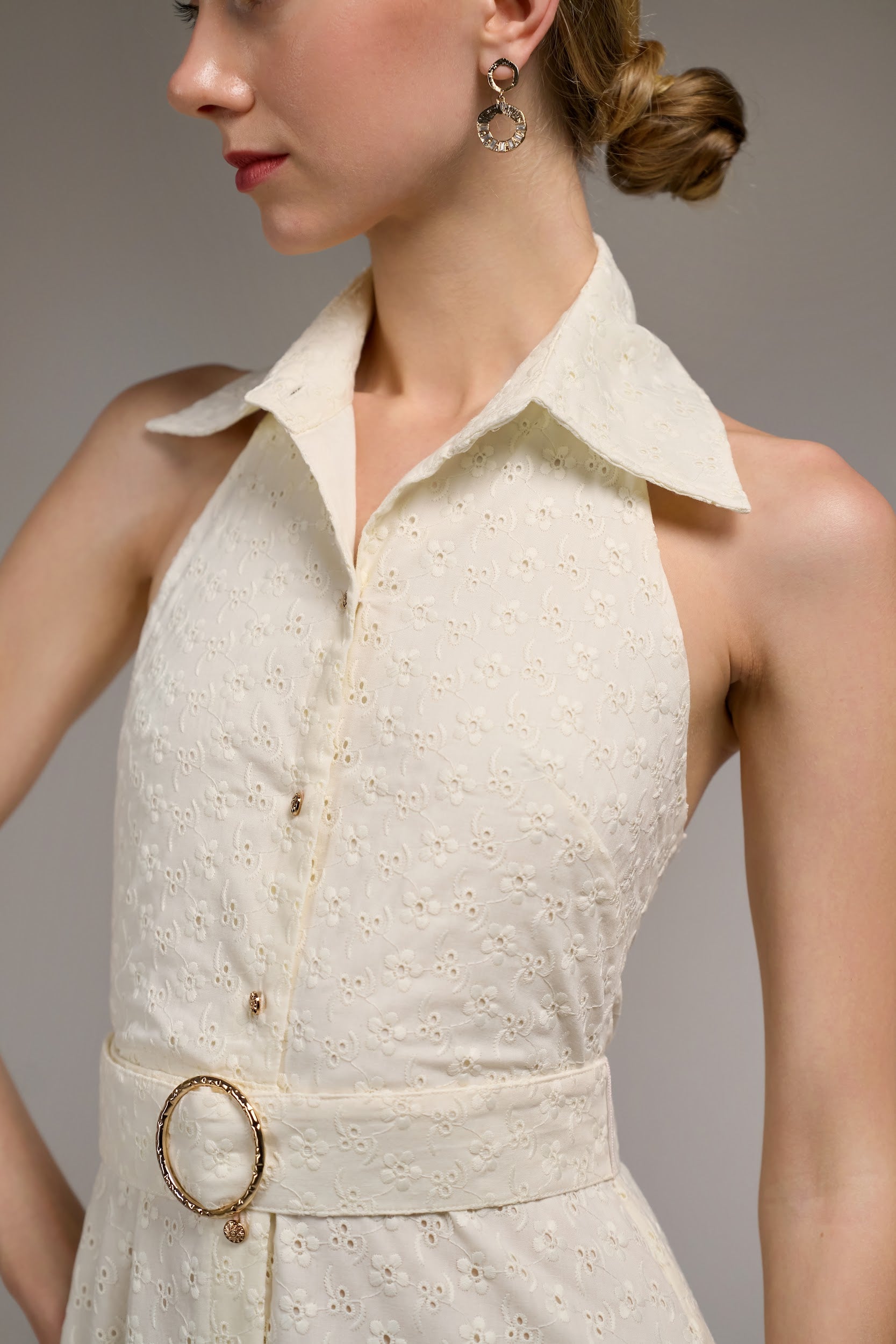 Where timeless charm meets effortless grace. Crafted from delicate broderie anglaise cotton, this sleeveless midi dress exudes summer elegance. Featuring a tailored collared neckline, front button-down detail, and a cinched waist with a matching belt and round buckle, the silhouette flatters with ease and sophistication. Finished in a soft ivory hue, it’s the perfect piece for garden soirées, coastal escapes, or quiet moments of luxury.
