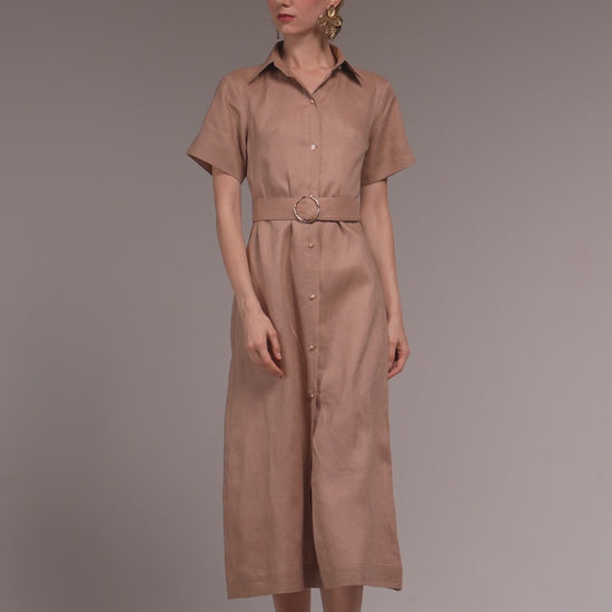 This flattering linen dress in a warm taupe tone exudes effortless elegance. Its subtly structured silhouette offers graceful movement, adding a soft, feminine appeal. Refined finishings with exquisite gold details, from the buttons to the belt enhancing this piece making it both elevated and sophisticated.