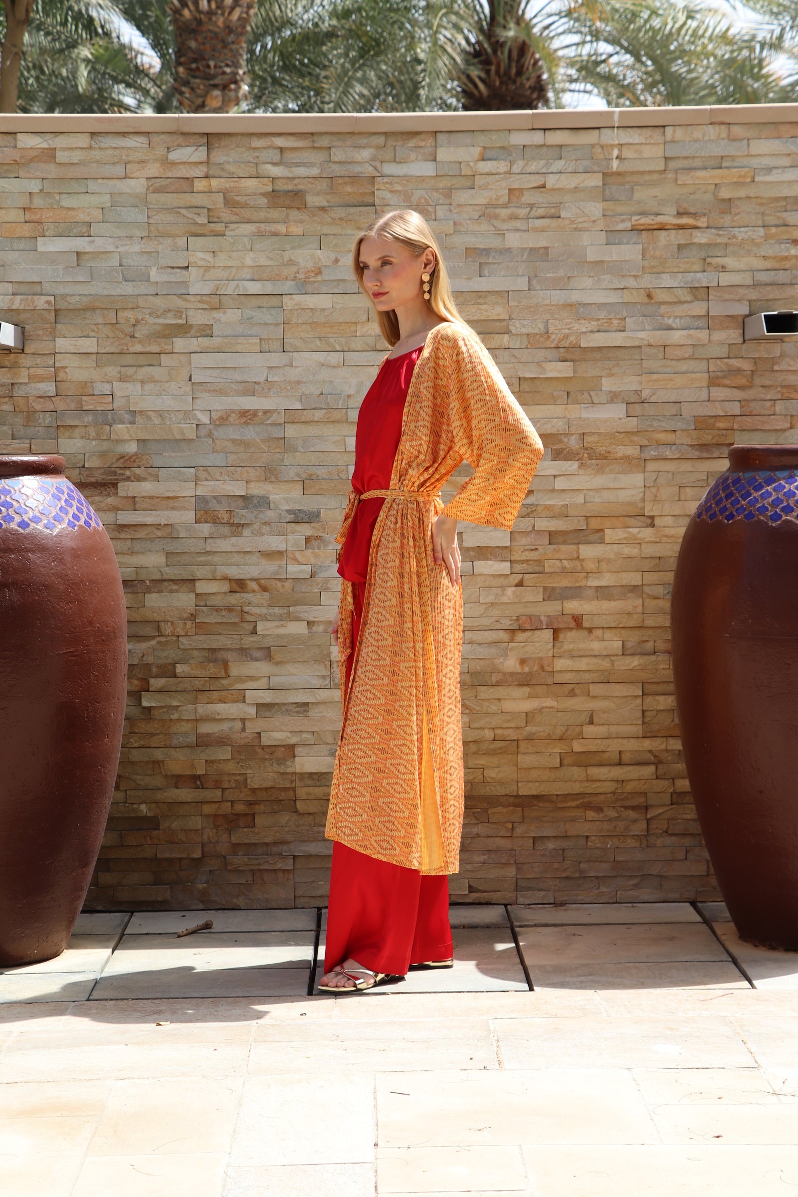 chain straps, and is styled with a fully embroided vibrant kimono with geometric