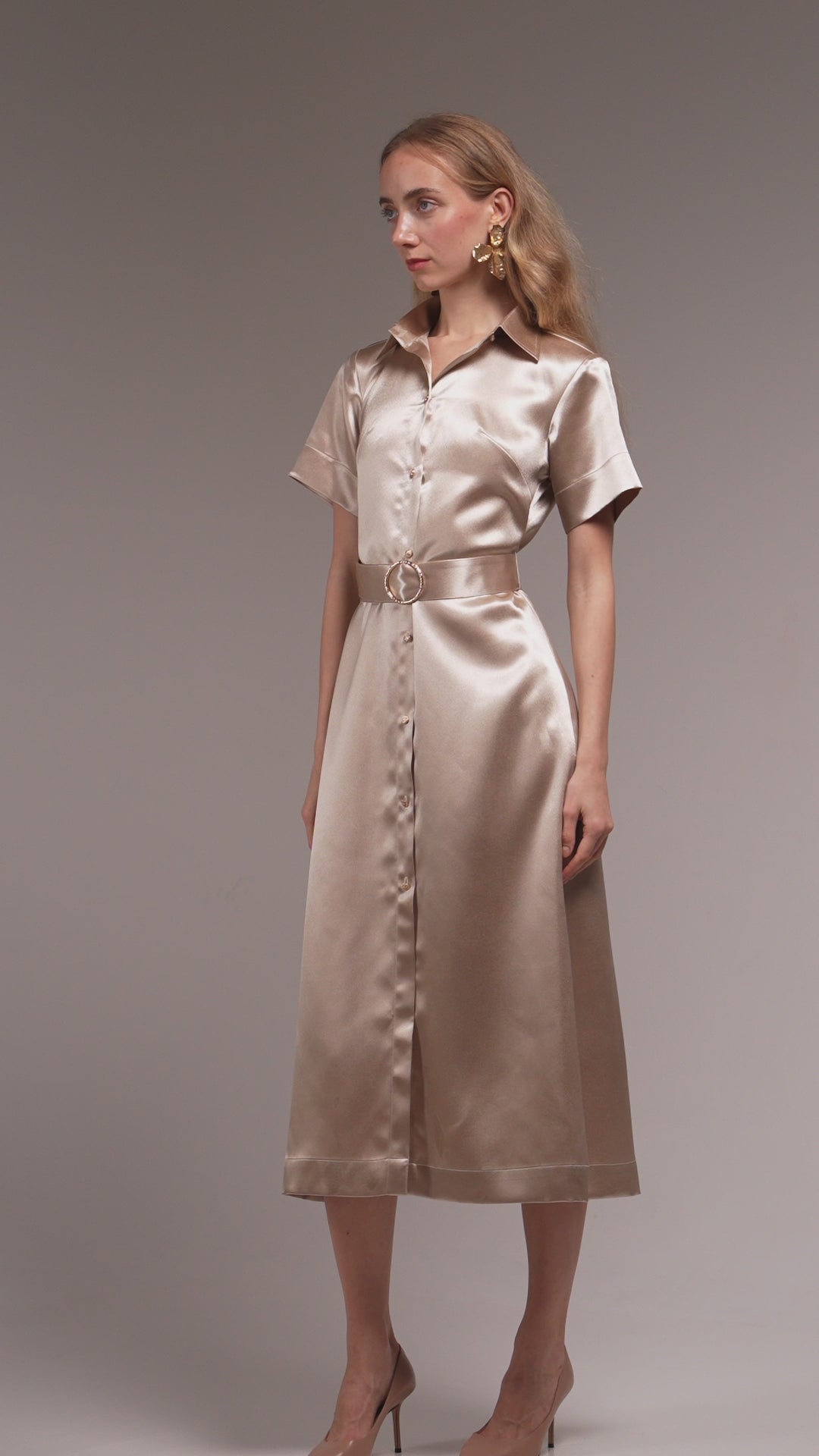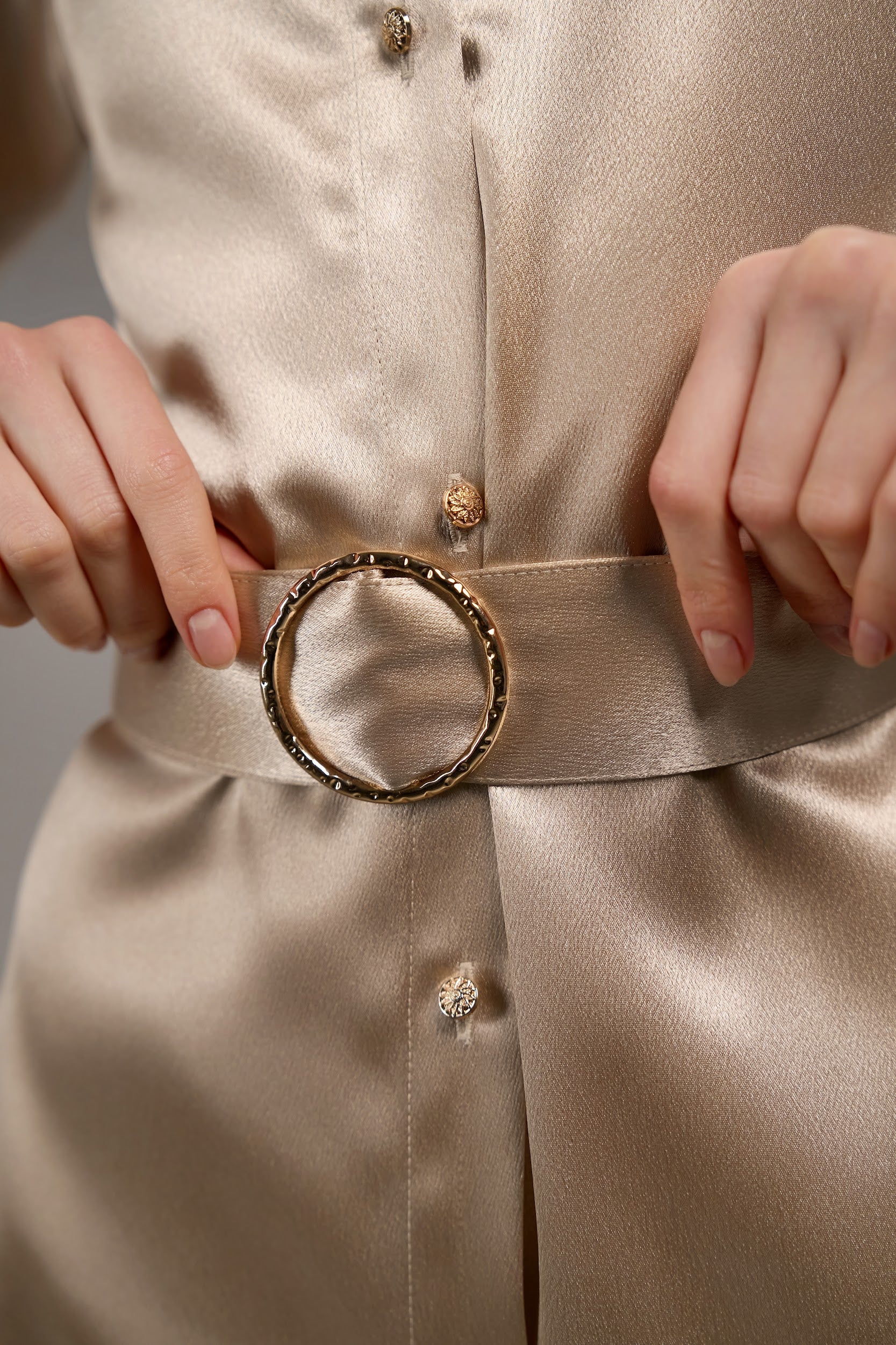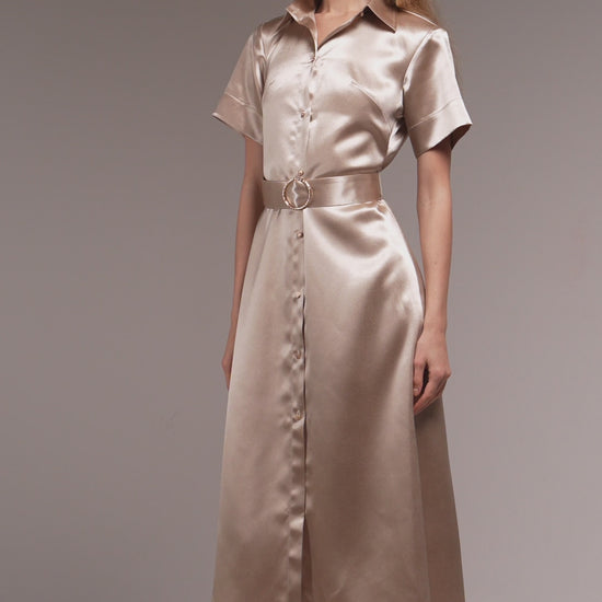 An ethereal silk dress in a soft champagne hue. Fluid, luminous, and undeniably enchanting. Its delicate structure and flowing silhouette evoke the quiet mystery of a modern muse. A Accented with refined gold details from button to belt that give the dress a subtle gleam, This piece a garment made for the elegant woman who moves through the world with effortless allure.