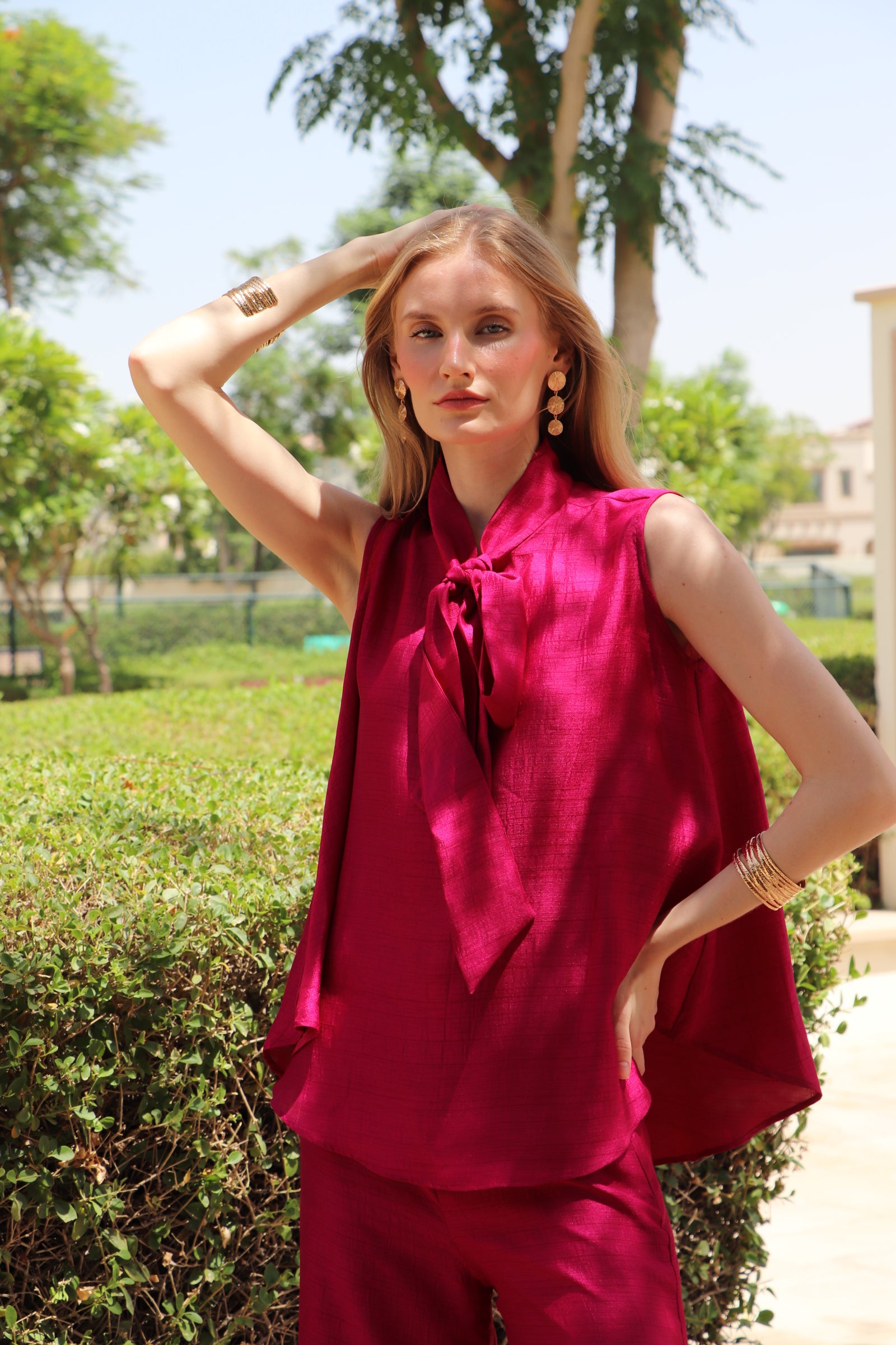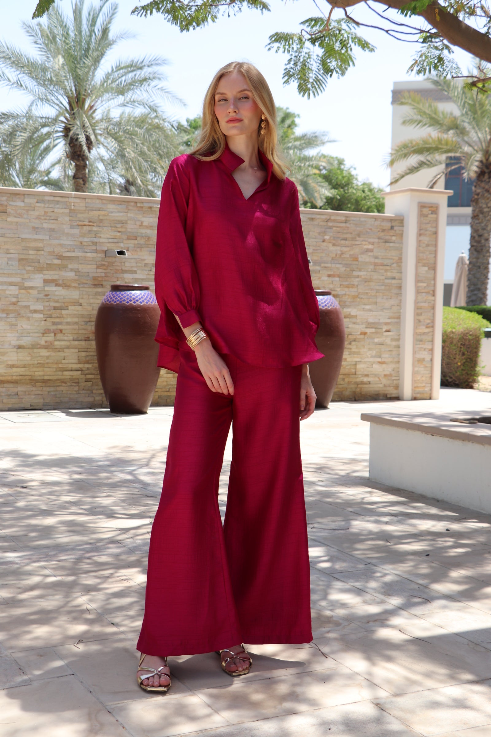 The Sirena Set features a relaxed-fit blouse with soft gathered sleeves and a subtle V neckline, finished with a structured high collar for a polished edge. Paired with wide-legged trousers, the silhouette is both refined and comfortable. The silk-linen blend creates a beautiful texture that elevates the set.